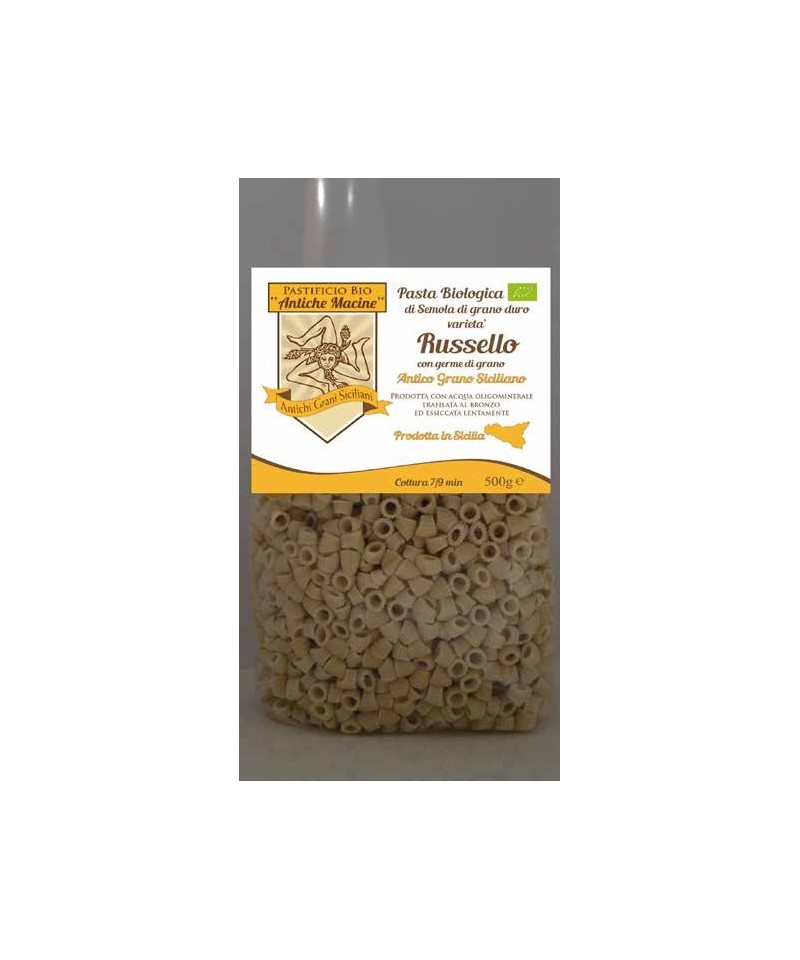 Trockene Nudeln aus Bio-Mehl des alten sizilianischen Hartweizens Russello, erhalten durch Fräsen mit Naturstein.