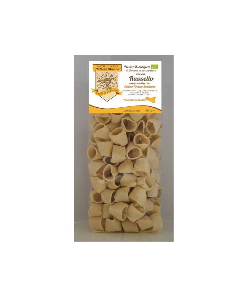 Trockene Nudeln aus Bio-Mehl des alten sizilianischen Hartweizens Russello, erhalten durch Fräsen mit Naturstein.