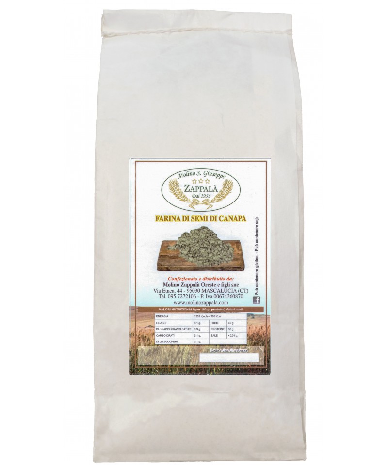 Mehl, das durch Mahlen von Hanfsamen gewonnen wird. Reich an Ballaststoffen, Omega 3 und Omega 6, Fettsäuren, die für unseren Körper aufgrund ihrer antioxidativen Eigenschaften wichtig sind.