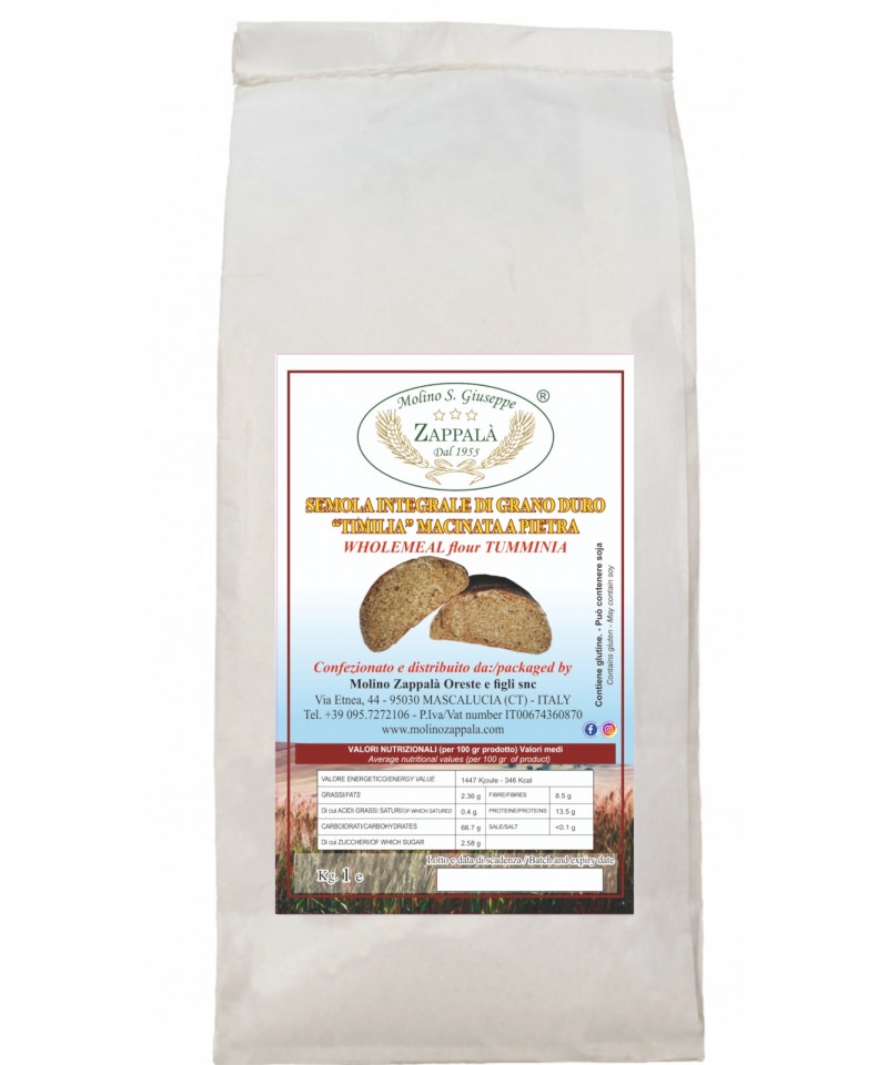 Das Mehl von TUMMINIA wird aus alten Steinmühlsteinen hergestellt, die den alten Traditionen folgen. es ist ein leicht getrommeltes Vollkornmehl, es enthält viele Spurenelemente von Weizenkeimen und Kleie; Es hat einen hohen Proteinwert und einen niedrigen Glutenindex. Dieses Mehl eignet sich sehr gut zum Backen und muss relativ schnell (ca. 4 Monate) verzehrt werden, um seine organoleptischen Eigenschaften nicht zu verlieren.