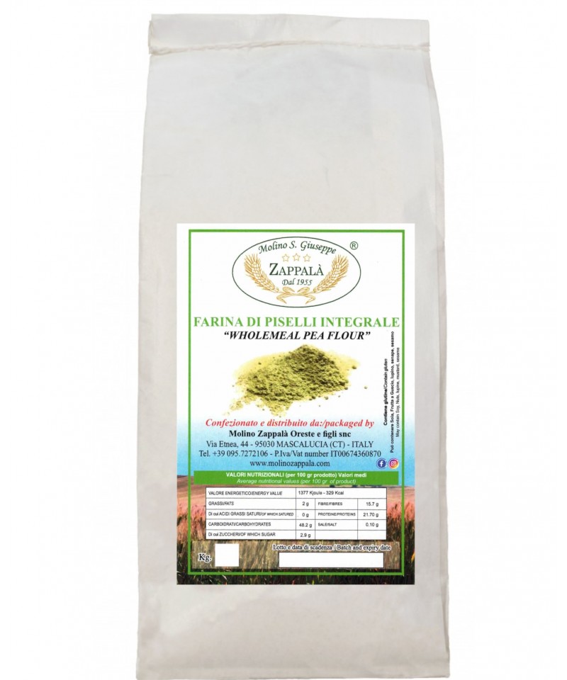 Questo particolare tipo di farina è ottenuto dalla macinatura dei semi del pisello precedentemente essiccati. È una farina ricca di proteine, amido, fibre, sali minerali, vitamine, antiossidanti. Insomma, possiede le stesse preziose proprietà dei piselli con il vantaggio di poterla usare in molti altri modi rispetto alle ricette nelle quali adoperiamo questi legumi, come per crepes, farinata, pasta fresca o polpette vegetariane. E' inoltre ricca di proteine, calcio, potassio, ferro e fosforo, nonchè di fibra insolubile e solubile, tra cui due probiotiche, l'inulina e la pectina (in parte fermentate dalla flora batterica con la produzione di importanti acidi grassi, il propionico e il buttirico). Tra le vitamine spiccano la B1, B2, B3 e A.