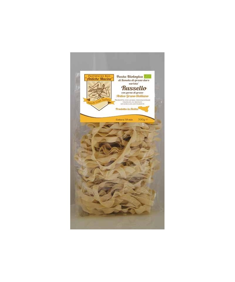 Pasta secca di sfarinato biologico di antico grano duro siciliano Russello, ottenuto da molitura a pietra naturale .