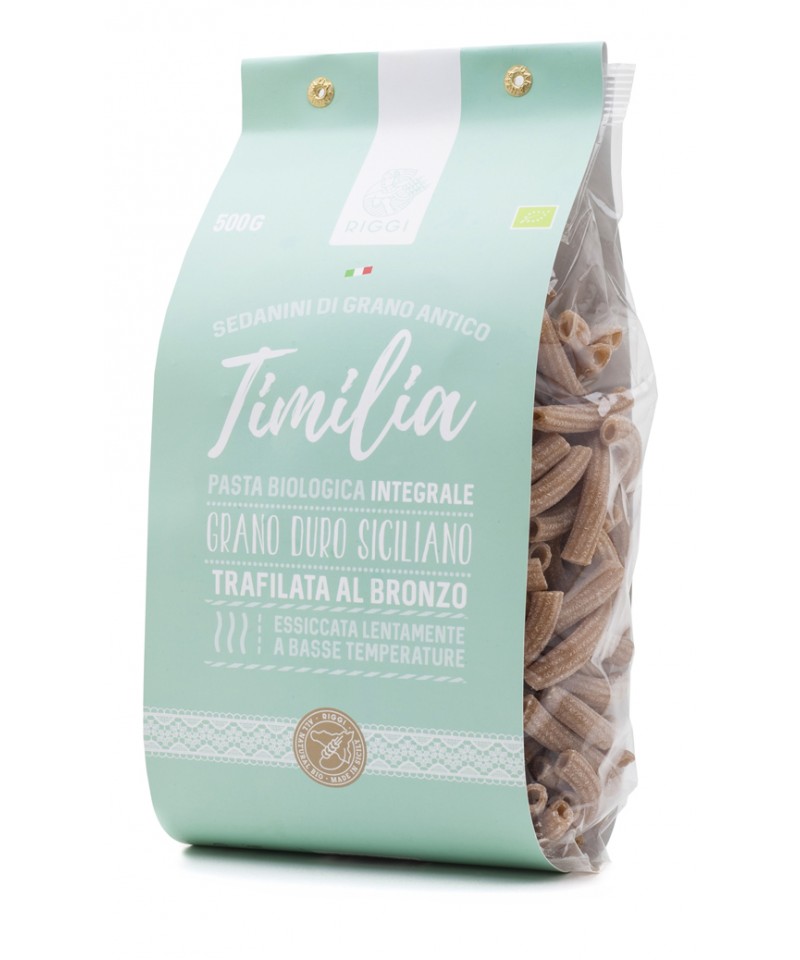 Pasta secca di sfarinato biologico di antico grano duro siciliano Timilia, ottenuto da molitura a pietra naturale .